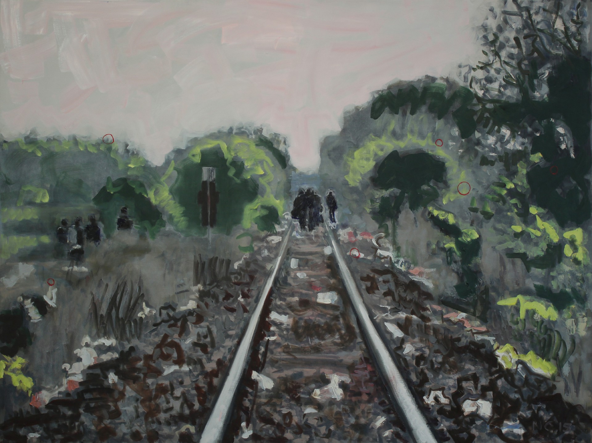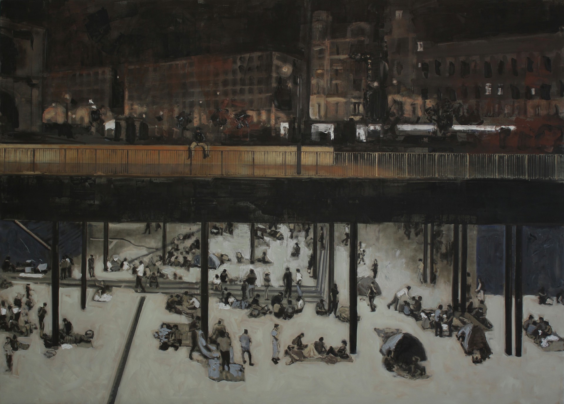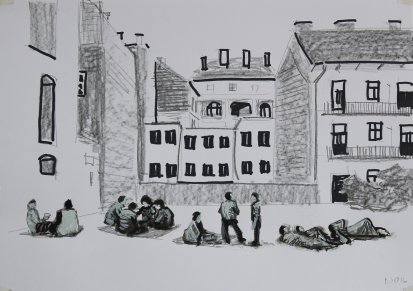 V logické návaznosti potom výstavní kolekce pokračuje ukázkou z cyklů, které vznikaly v letech 2012–2014 a odrážely změny ve veřejném prostoru často přímo ovlivněné nástupem Orbánova politického režimu (Večerní demonstrace, 2013). Znepokojivé obrazy protirežimních protestů jsou doplněny kresebnou dokumentací nově vznikajících prostorů a organizací, ve kterých na pomezí legality dochází ke spojování na okraj společnosti vytlačovaných představitelů nezávislé kultury a neziskových organizací (Utopie, bar na ruinách, 2011–2013).Těžiště výstavní prezentace Csaby Nemese v Domě umění Ústí nad Labem se potom nalézá v sériích vytvořených v posledních dvou letech (2015–2016), které se převážně soustředí na reflexi událostí spojených s přistěhovaleckou krizí.
