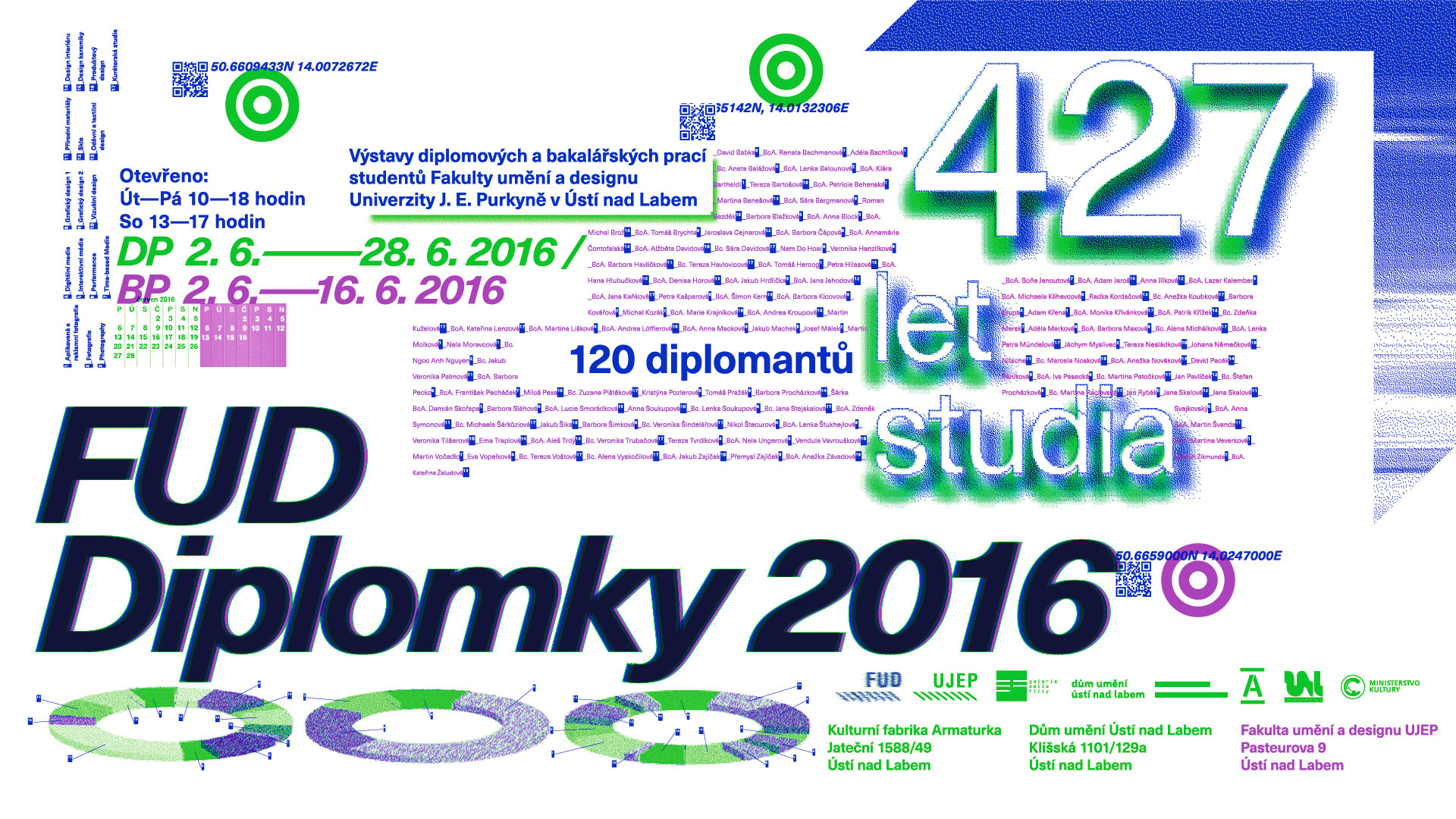 Závěrečné práce představují přehlídku také samotné školy jako umělecké a vzdělávací instituce. Ilustrují její svobodnou a tvůrčí atmosféru a zaměření na aktuální umělecké a designové trendy. Čerstvým bakalářům budou patřit prostory samotné budovy FUD v kampusu univerzity. Diplomovým pracím byla věnována celá kulturní fabrika Armaturka spolu s velkolepým prostorem Galerie Emila Filly a Galerie Pro design. Nové prostory Domu umění v Ústí nad Labem celé patřili diplomovým pracím Katedry elektronického obrazu. Prezentace v prostorách dvou významných výstavních institucí bylo pro diplomanty symbolickým vyústěním jejich studia na svobodnou uměleckou půdu. Propojení a dlouhodobá spolupráce s těmito institucemi charakterizuje jeden z významných cílů fakulty, tedy intenzivně se podílet na zkvalitnění kulturního a společenského života v Ústí nad Labem.