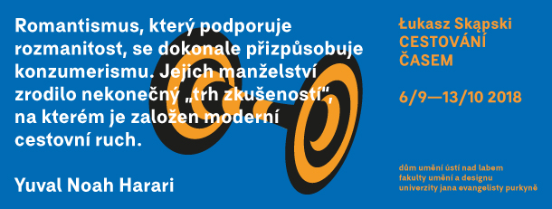 Výstava Łukasze Skąpského nazvaná Cestování časem a připravená přímo pro Dům umění Ústí nad Labem je inspirována jeho zkušeností s realitou současné Keni, kde na jaře tohoto roku strávil měsíc na studijním pobytu. Autor navíc pobýval mimo hlavní město v menším sídle Kilifi na břehu Indického oceánu a mohl tak zažít realitu afrického venkova bez určujícího a zkreslujícího vlivu globálního turismu. Zdá se, že tento zážitek ve Skąpském částečně vyvolal reminiscence na období společenské transformace následující po pádu komunistického režimu v Polsku a v celé Střední Evropě na počátku devadesátých let dvacátého století. Tehdejší touha obyvatel tohoto regionu stát se rychle a bezbolestně pevnou součástí západního světa stejně jako vzpomínky na zástupy turistů lačnících poznat nově se otevírající, levný a exotický svět jakoby před umělcem otevíraly perspektivu porovnání zdánlivě tak odlišných historických situací, respektive geografických a kulturních prostředí.