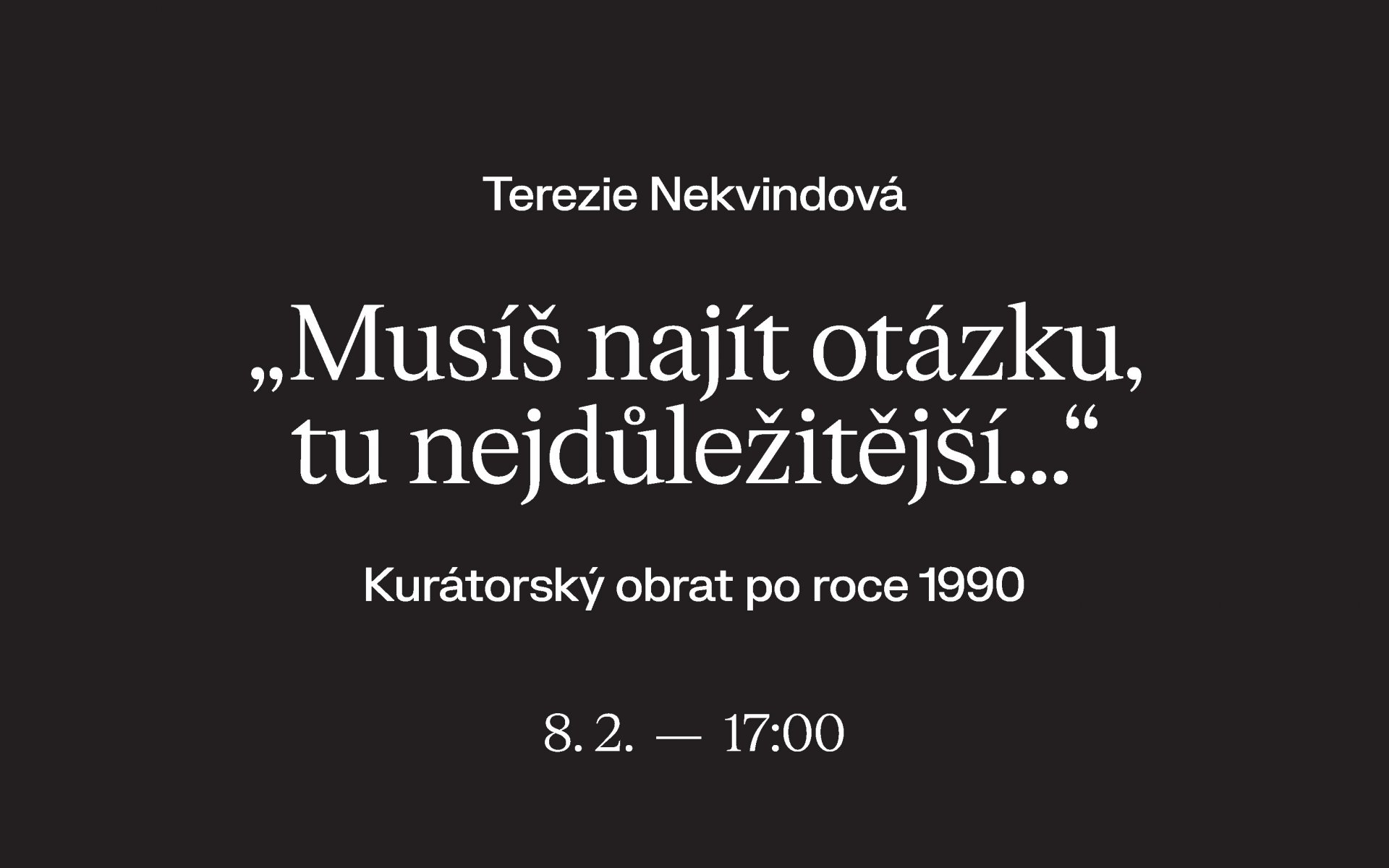 V 90. letech se v českém prostředí etabluje profese kurátora/kurátorky a výstava se nově stává tím místem, kde se formulují klíčové problémy soudobého umění. Z jakých důvodů a za jakých okolností se tento přerod, označovaný jako tzv. kurátorský obrat, uskutečnil? Přednáška představí hlavní kurátorské osobnosti 90. let, jejich výstavy a strategie, s nimiž ke své práci přistupovali. Nezapomene také zmínit, jakou roli v této dobové proměně sehrálo Ústí nad Labem.