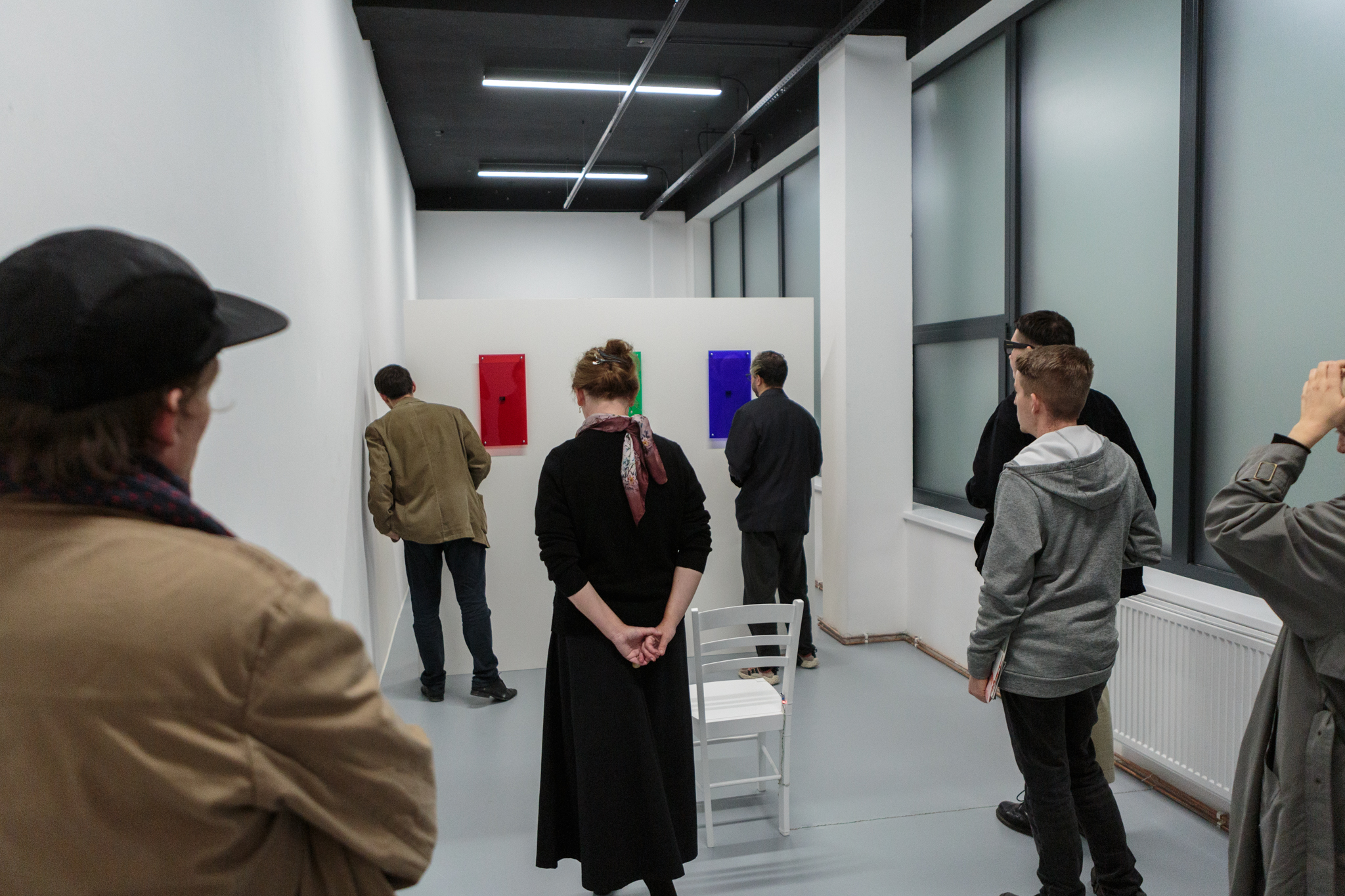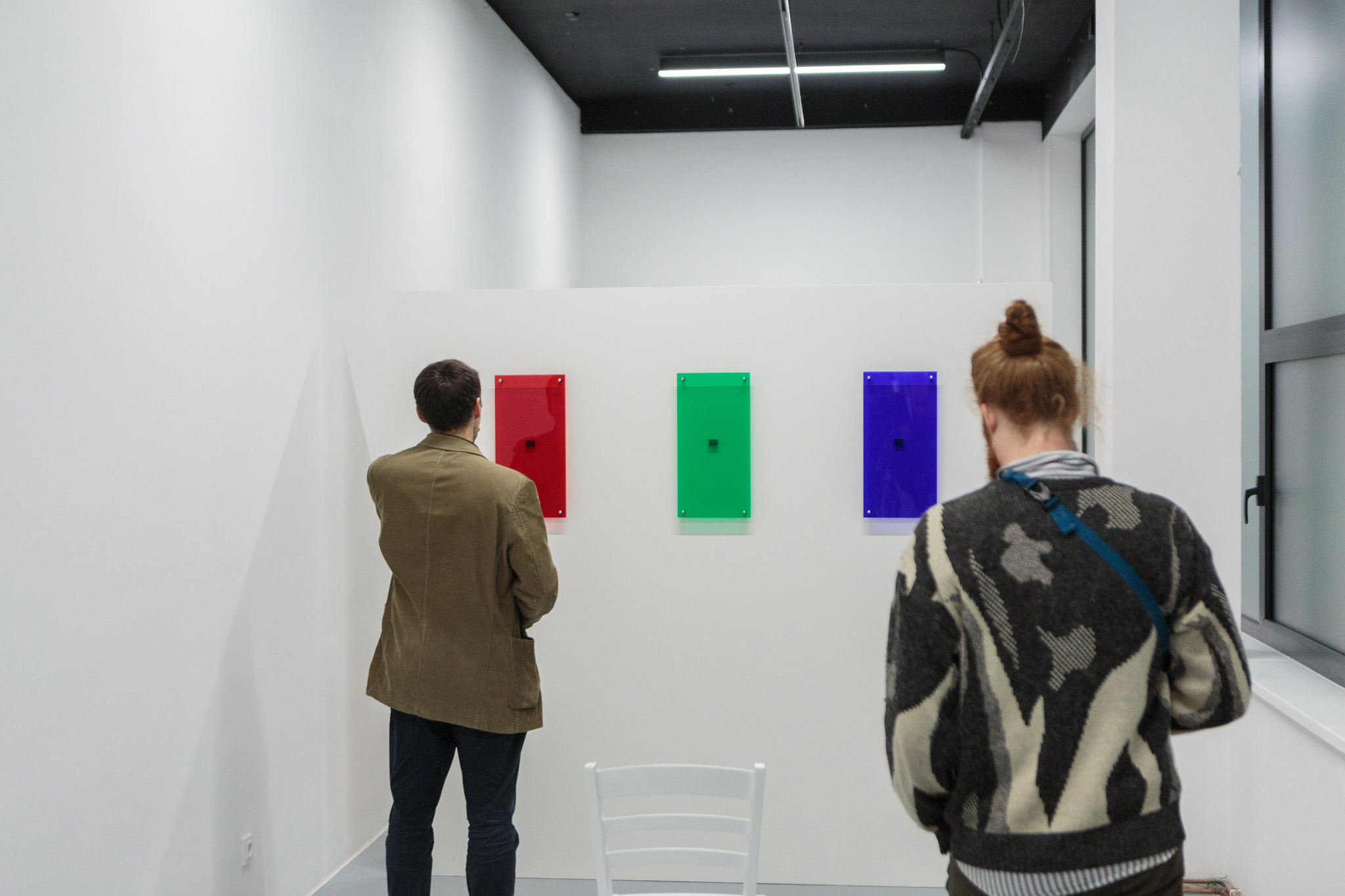 Z jedné strany tak vstupujeme do reálného či aktuálního světa – vstup do bílého galerijního prostoru vymezeného minimalistickou vizualitou RGB barev a fenoménem židle v uměleckém světě. Použití vizuální RGB zkratky (červené, zelené a modré) odkazuje k míchání barev v dnešních technologiích. Židle zde pak zastupuje jistou filozofickou otázku, co to vlastně židle je, jaké má funkce nebo jaká je její symbolická pozice ve vizuální kultuře. V instalaci Zdeňka Svejkovského slouží židle jako pomyslný výchozí bod toku dat, kdy se nacházíme na hranici mezi technologiemi a člověkem.
