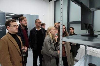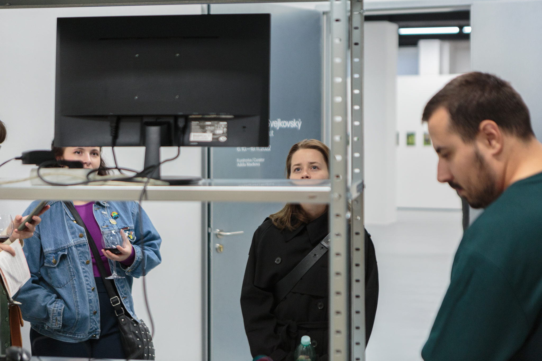 Za středovou bílou zdí se pak nachází druhý vstup či náhled do expozice výstavy, který nabízí vhled do datového zázemí. Data se zde shromažďují po dobu konání výstavy a doplňují se o autorovy osobní texty o světech, kde se pohybuje. Vzniká záznam, který generuje nový narativní příběh opět v podobě informací.